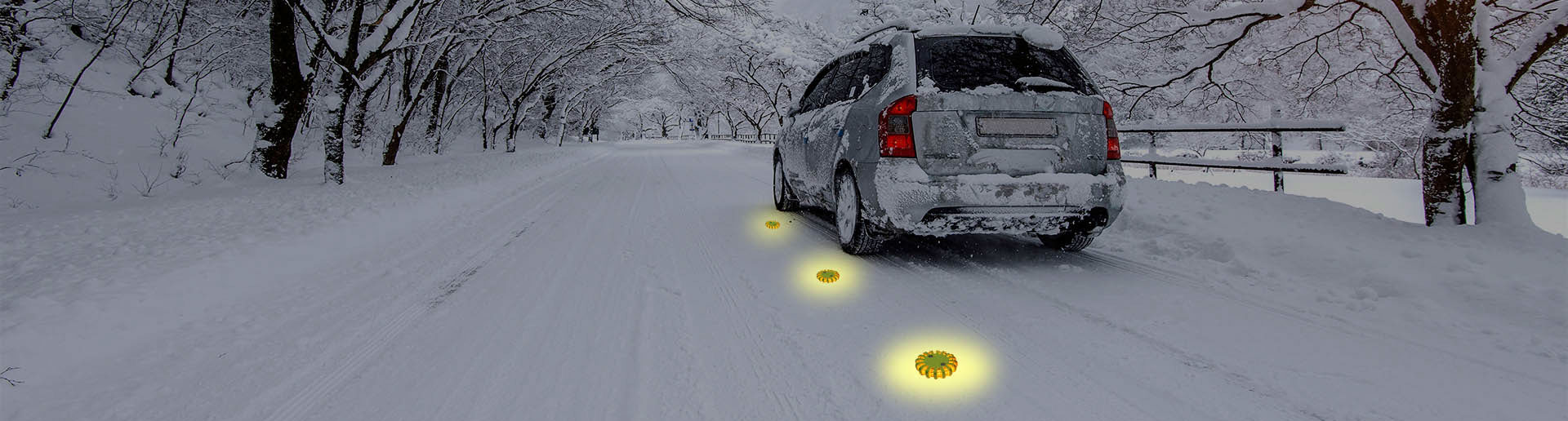No matter the road ahead, we help you stand out in the worst of weather. Every time. Photo of car stopped in the snow at night with bright flares keeping the family safe.